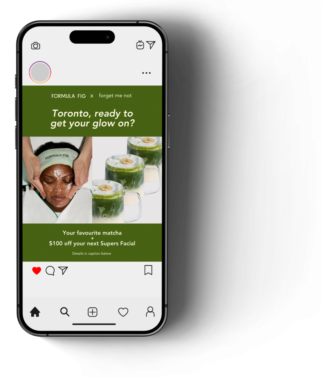 Formula Fig partnered with Forget Me Not Ossington on a limited-time “Mathca TLC” promotion, where guests received a $100 Supers Facial coupon with any Matcha latte or Banana Bread Matcha Latte. The goal was to communicate the offer and its conditions quickly across social media and in-store signage to drive awareness and redemptions.
